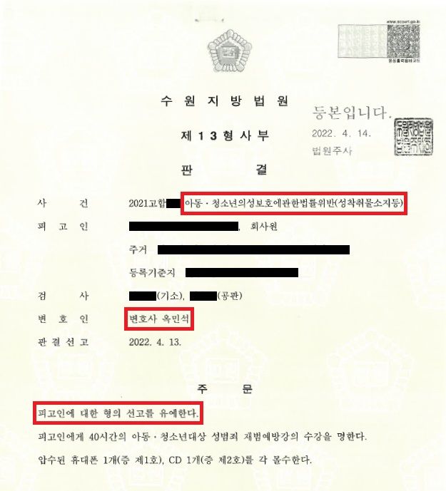 이러한 저의 조력을 바탕으로 A씨는 '선고유예'를 선고받음으로써 2년이 경과하면 면소된 것으로 간주되어 어떠한 전과기록도 남지 않게 될 뿐만 아니라 신상정보등록 의무도 면하게 될 수 있었습니다.