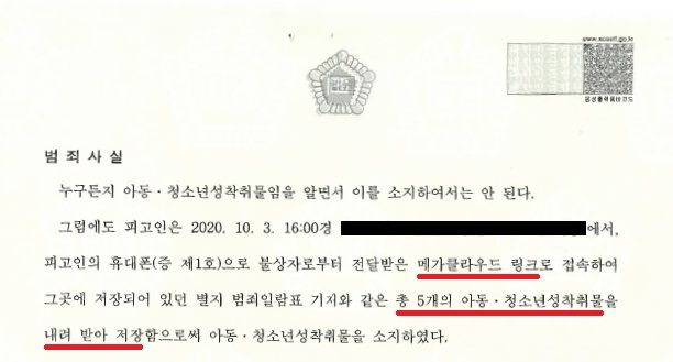 제11조(아동·청소년성착취물의 제작·배포 등) ⑤ 아동·청소년성착취물을 구입하거나 아동·청소년성착취물임을 알면서 이를 소지·시청한 자는 1년 이상의 징역에 처한다.
