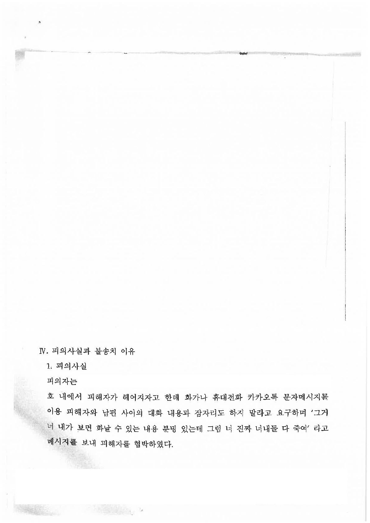 이 사건은 전송된 카카오톡 메세지 내용만 놓고 볼 때는 협박죄에서 말하는 해악의 고지에 해당함이 명백하여 죄가 성립될 가능성이 높았습니다. 다만 본 변호인은 이 사건에서 피해자와 의뢰인의 두 사람의 관계가 매우 독특하였다는 것에 주목하였는데, 두 사람은 일반적인 연인관계와는 달리 각자 가정이 있는 상황이었고, 헤어졌다가 만나는 과정을 수차례 반복하였던 과거가 있었습니다. 실제로도 이 사건과 같은 문자메세지 발송 이후에도 두 사람은 연인관계로서 여행을 함께 가는 등 우호적인 관계를 유지하였고, 피해자가 협박죄로 고소를 하게 된 동기도 피해자의 진정한 의사라기 보다는 피해자의 남편이 의뢰인의 존재를 알게 된 탓이 컸습니다.