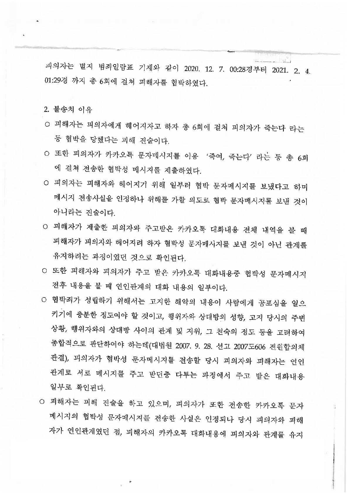 이에 변호인은 이 사건이 발생하기 전 두 사람의 관계에 대해 상세히 설명하고, 사건 이후의 정황에 대해서도 사진, 문자메세지 등 증거자료와 함께 상세한 설명을 담은 변호인의견서를 제출하였습니다.