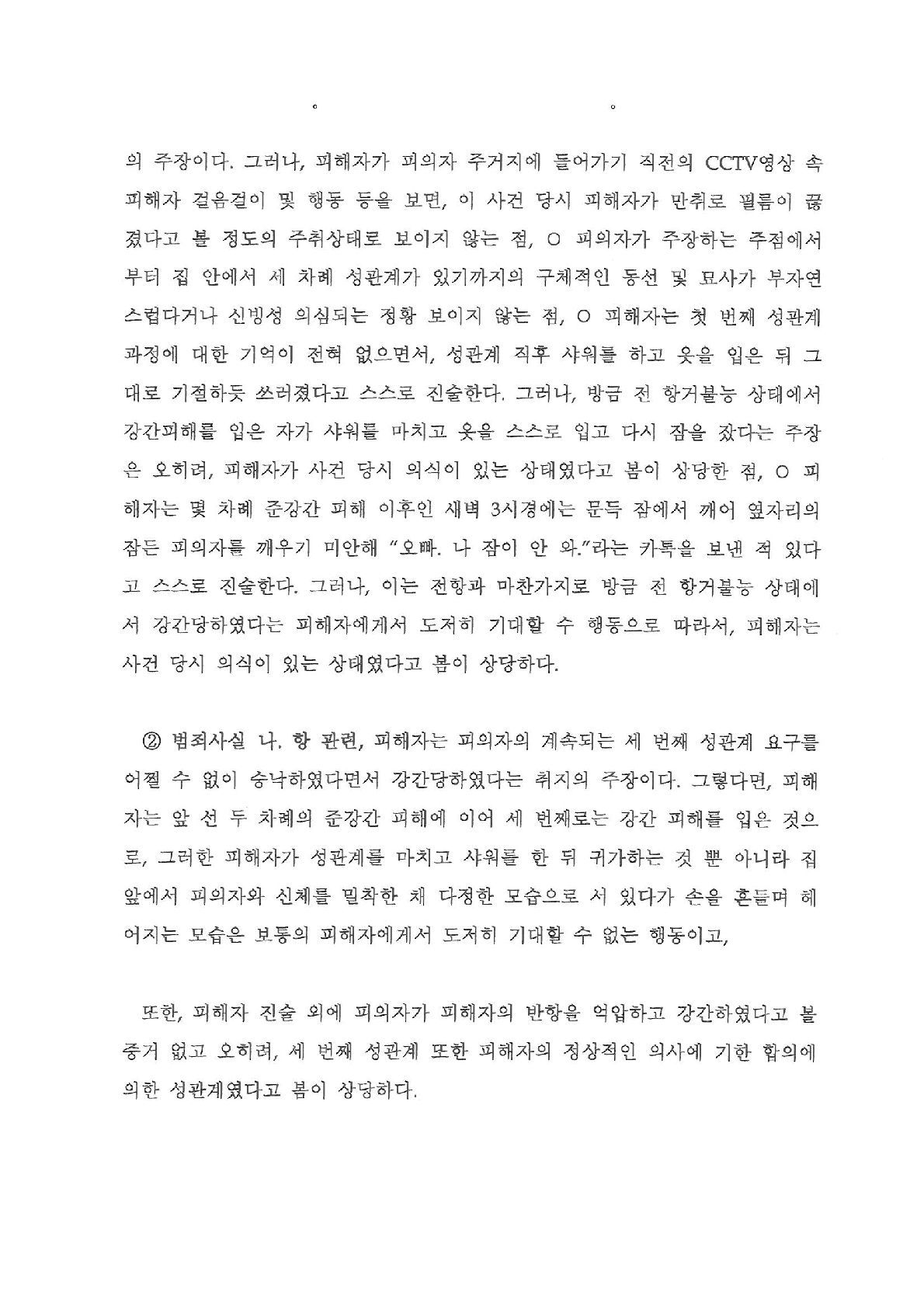 본 변호인이 판단하였을 때 고소사실 중 준강간과 강간 부분의 피해자의 주장에 모순점이 많아 쉽게 반박이 가능하였고, 충분히 방어가 된다고 보았습니다. 예컨대 항거불능 상태에서 강간당하였다고 보기 어려운 피해자의 말과 행동들(성관계 전후 샤워를 하였다거나, 함께 식사를 하거나, 장소를 이탈하지 않고 잠이 든 점 등)은 진술의 신빙성을 탄핵하기에 충분했습니다.