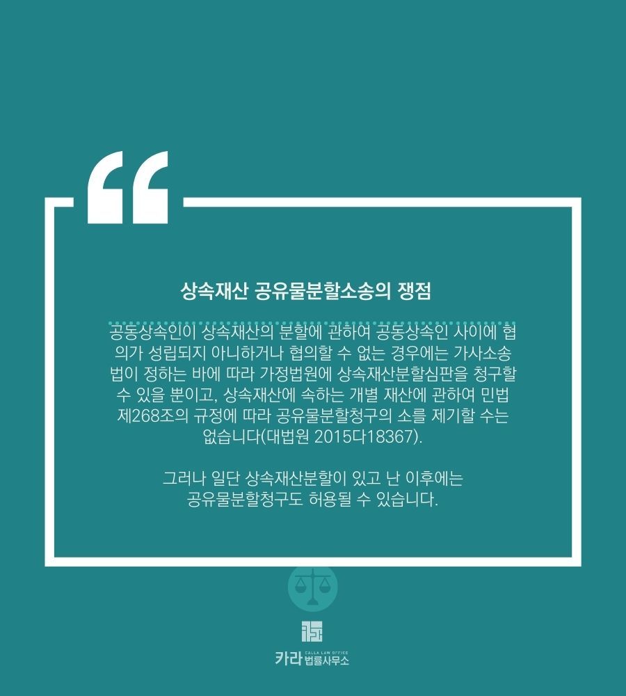 그러나 일단 상속재산분할이 있고 난 이후에는 공유물분할청구도 허용될 수 있습니다.
