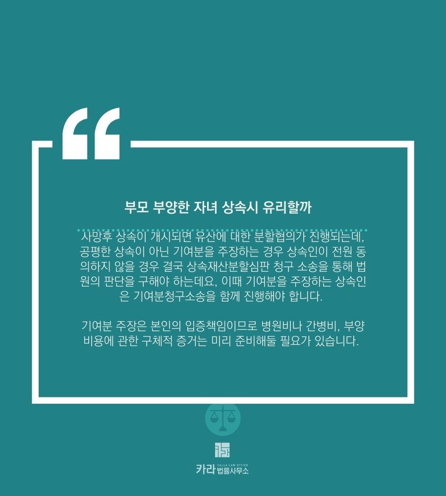 또한 자녀간 다툼이 발생하지 않도록 부모를 부양하는 자녀는 기여분 청구에 대비해 각종 지출 자료 등을 객관화하여 준비해 둘 필요가 있습니다.
