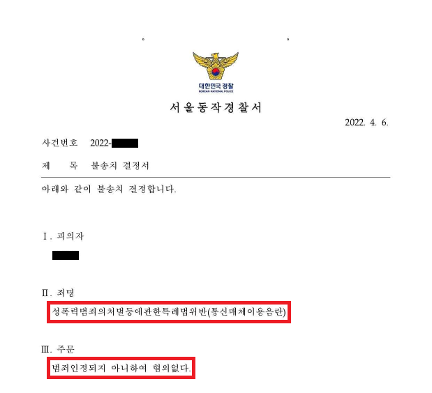 이러한 저의 조력을 바탕으로 A군은 전혀 모르는 사람에게 다짜고짜 성적인 채팅을 수차례 전송하였음에도 불구하고 '불송치(범죄인정안됨)' 결정을 받음으로써 성범죄자가 될 위기에서 벗어날 수 있었습니다.