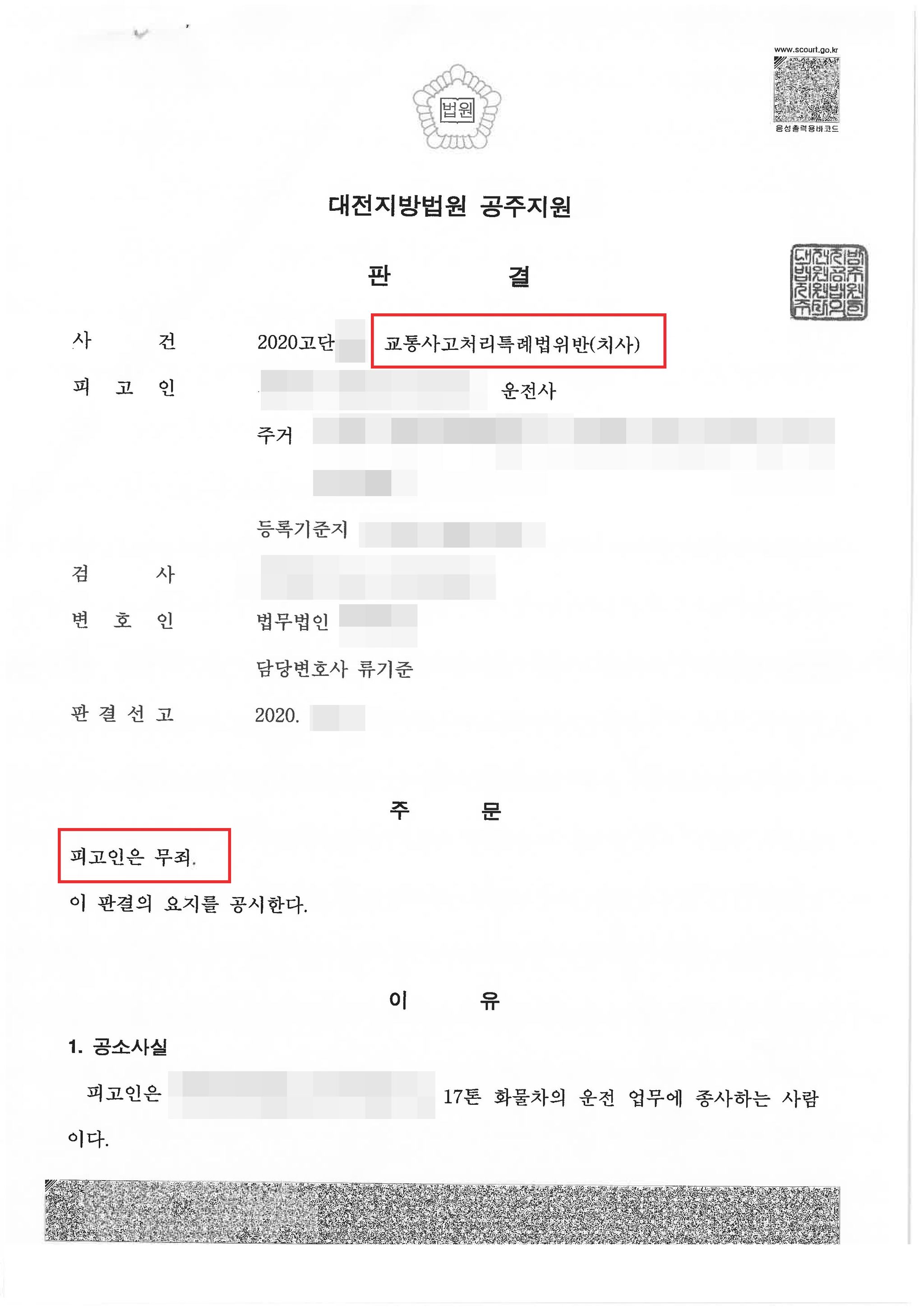 다행히 재판부는 의뢰인에게 업무상 과실이 있었다고 단정할 수 없다면 무죄판결을 선고하였습니다.