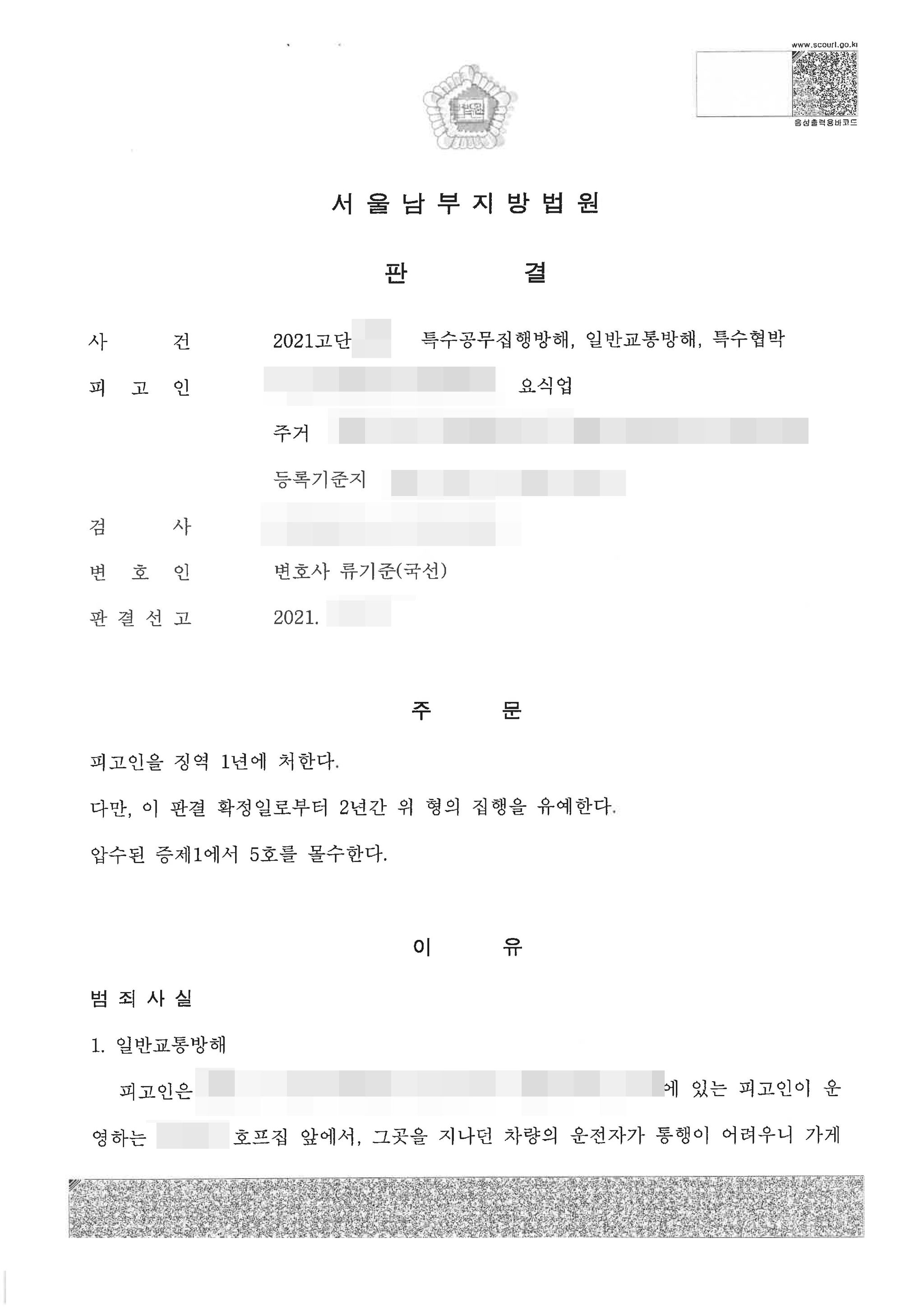 의뢰인은 호프집을 운영하는 사장으로, 운영하는 호프집 앞을 지나던 차량의 운전자가 통행이 어려우니 가게 앞에 세워둔 자전거를 옮겨달라고 말하였다는 이유로, 화가 나 가게 앞 도로에 자전거만이 아니라 플라스틱 주류상자, 플라스틱 의자 등을 던져놓아 지나가던 차량의 통행을 막아 도로교통방해죄로 입건이 되었습니다.