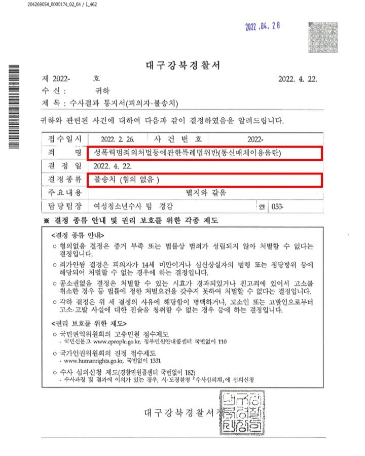 이러한 저의 조력을 바탕으로 A씨는 '불송치(혐의없음)' 결정을 받음으로써 억울하게 성범죄자가 될 위기에서 벗어날 수 있었습니다.