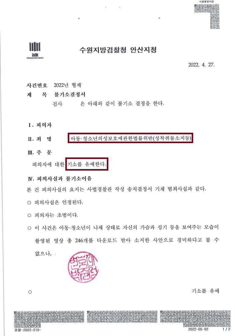 한때 n번방 및 아청물(성착취물) 소지.시청 사건과 관련하여 검찰청 내부적으로도 절대 선처가 없는 엄단 조치를 한 바도 있지만 기소유예 처분이 아예 불가능한 것 또한 아니기에 바로 포기하지 마시기를 신신당부드립니다.