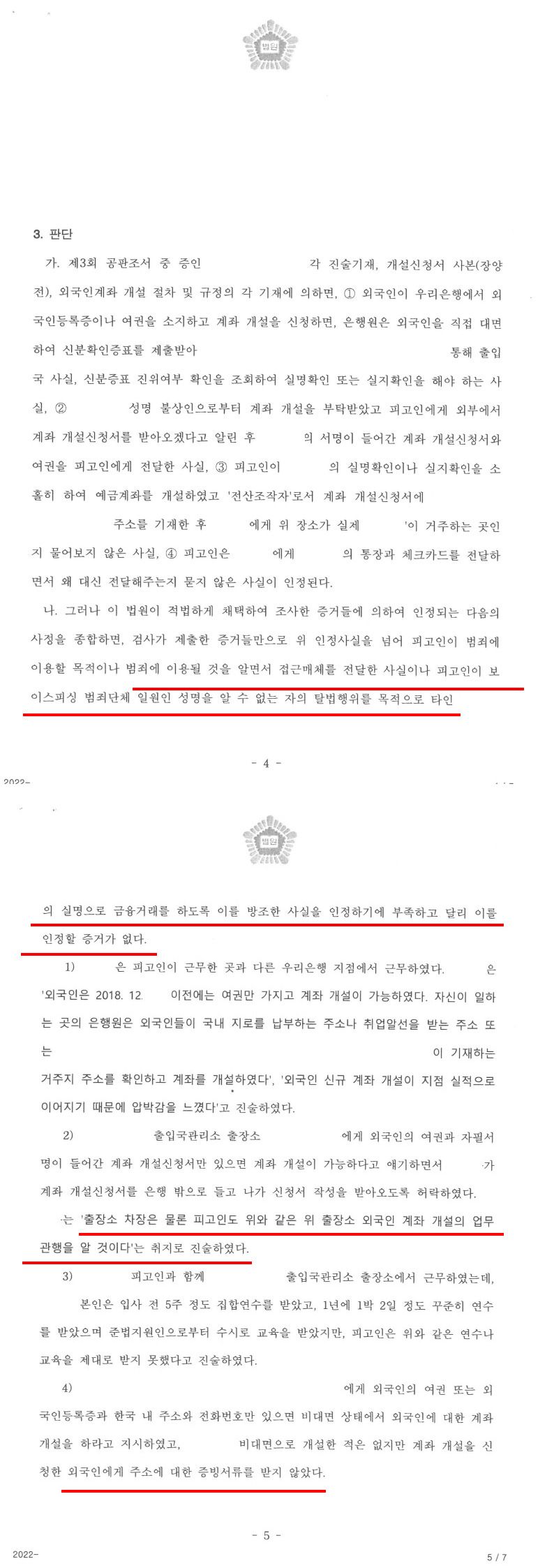 "피고인은 범죄에 이용될 목적으로 접근매체를 전달한 것이 아니기 때문에 전자금융거래법위반죄의 고의가 없다. 또한 재물의 교부를 받아 타인 실명으로 금융거래를 할 것임을 인식하지 못하여 금융실명거래및비밀보장에관한법률위반방조죄의 고의가 없다. "는 취지로 공판에서 무죄임을 강변했으며, 이 사건 관련 당사자들 전부를 증인신청하여, 피고인에게 유리한 각종 정황 및 관련 진술을 확보하는데 집중하였습니다. 그 결과, 아래 판시된 내용에서 보는 바와 같이 우리가 한 증인신문 내용 및 변호인의견서에서 개진한 내용 등이 전부 무죄판결의 이유로서 원용되었습니다.