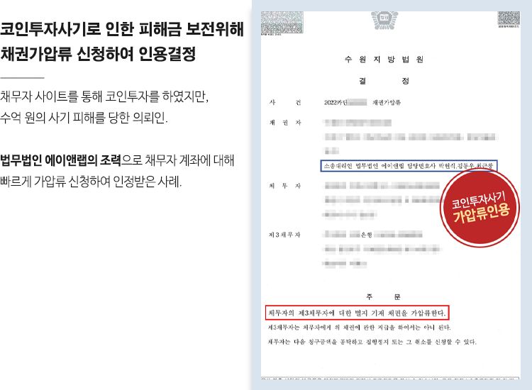 ![[민사]코인투자사기 피해자 대리하여 채권가압류 신청하여 인용](/_next/image?url=https%3A%2F%2Fd2ai3ajp99ywjy.cloudfront.net%2Fuploads%2Ftitleimage%2Foriginal%2F5c23344f227b15a91df80b76-original.jpg&w=3840&q=75)