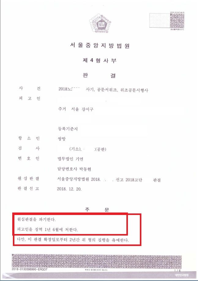 항소심에서 원심파기, 집행유예 판결로 석방됨