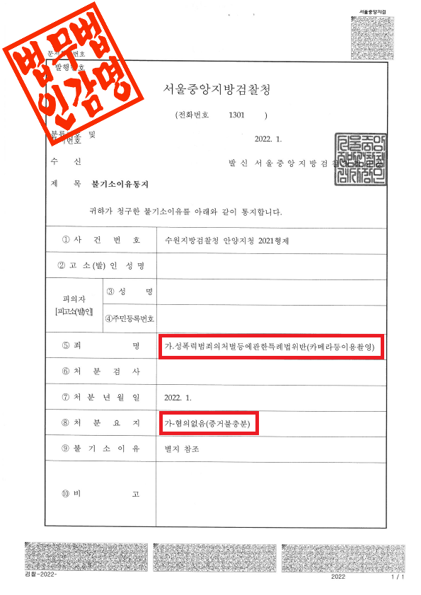 또한 상대방의 주장과 진술을 탄핵해 나아가며 고소인이 허위로 고소를 할 만한 사정이 있어 보이는 점과 그러므로 고소인의 주장은 신빙성이 낮다는 점에 대해서 주장하였습니다. 이 사건의 발생 경위, 촬영물에서 드러나는 고소인의 모습, 고소인이 허위 고소를 할 만한 정황 등을 고려하여 의뢰인의 행위는 구성요건 해당성이 없으며 객관적인 사실과 일치하지 않고 범죄가 되지 않음을 주장하며 의뢰인의 변호를 하였습니다. 의뢰인에게 유리한 증거자료 등을 제출하며 법리적으로 검토한 변호사 의견서를 제출하며 끝까지 최선을 다해 의뢰인을 위해 조력을 한 결과 수원지방검찰청에서는 아래와 같은 처분을 내리게 되었습니다.