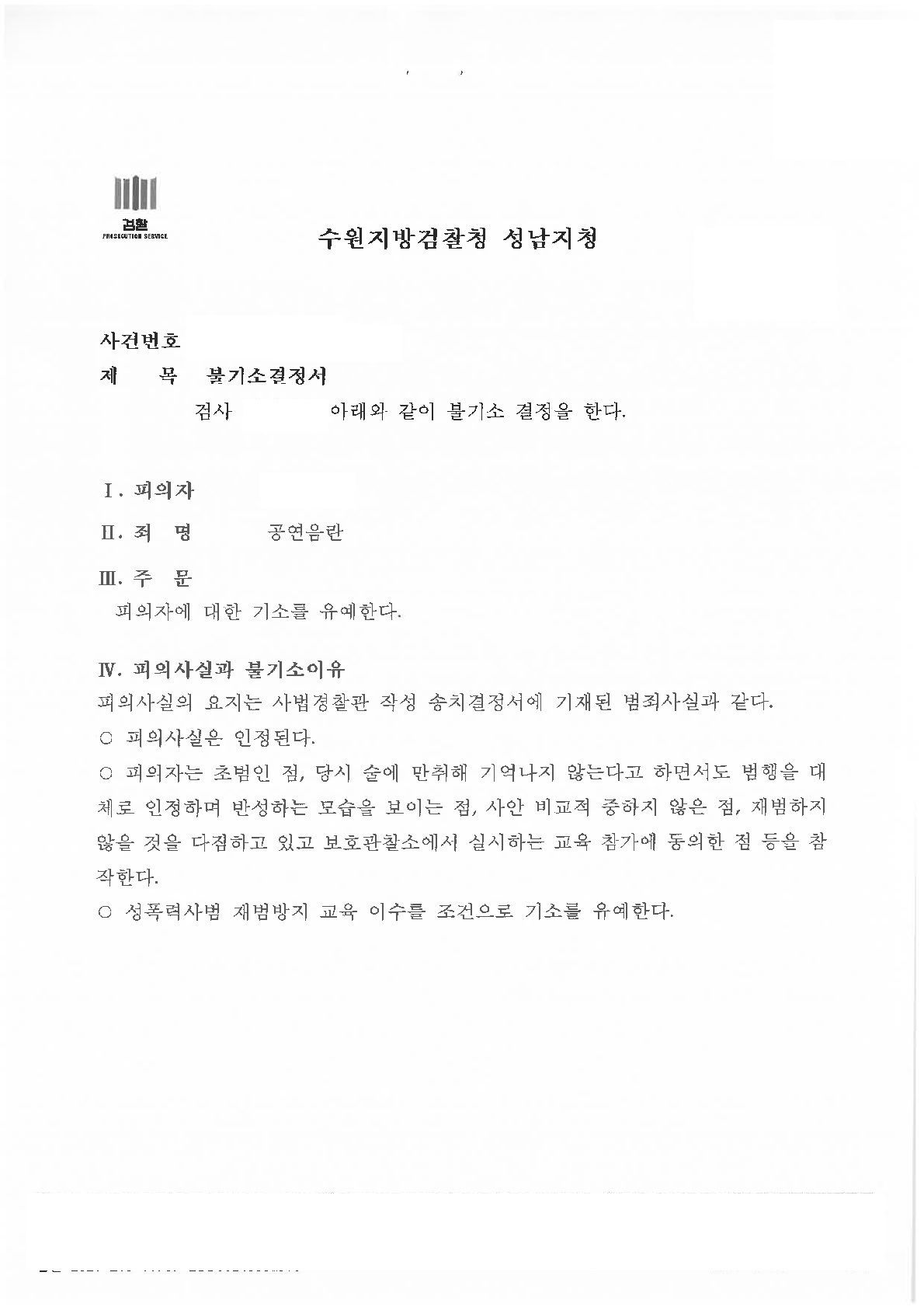 위와 같은 취지의 주장은 변호인으로서 법리주장을 한 것이고, 당사자인 의뢰인 본인은 어찌되었건 사회적으로 물의를 빚은 것이기 때문에 반성하는 태도로 조사를 받았습니다. 이와 같은 사정들이 종합적으로 고려되어, 의뢰인은 결국 기소유예의 처분을 받을 수 있었습니다.