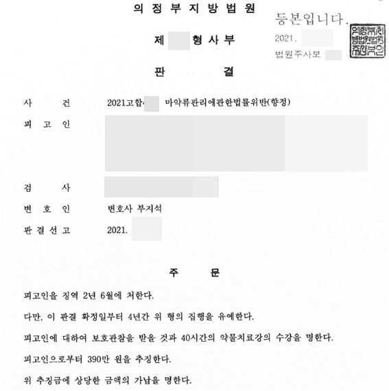 의정부지방법원은 의뢰인에 대한 혐의를 모두 유죄로 인정하여 의뢰인을 징역 2년 6월에 처하였지만, 의뢰인의 정상을 고려하여 4년간 형의 집행을 유예하는 판결을 선고하였습니다.