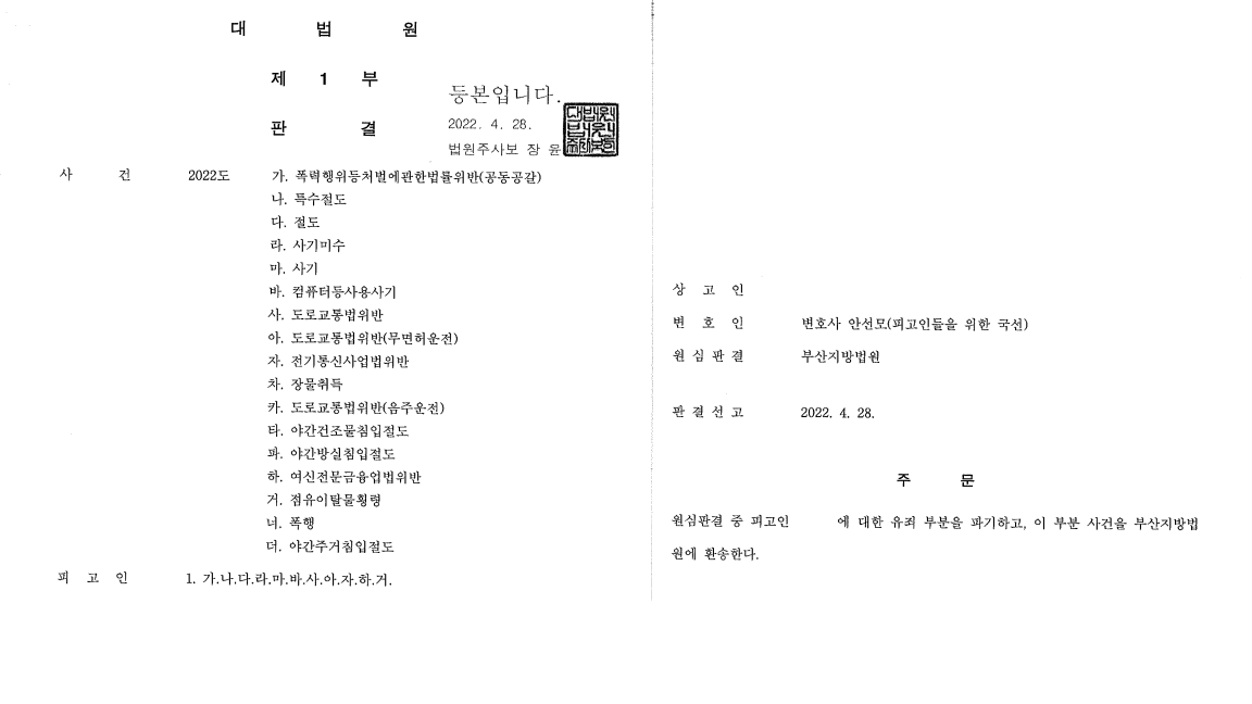 - 대법원은 2022. 4. 28. 안변의 주장 중 일부를 받아들여 의뢰인의 유죄 부분을 파기하고, 원심법원에 돌려보내는 파기환송 판결을 하였음.