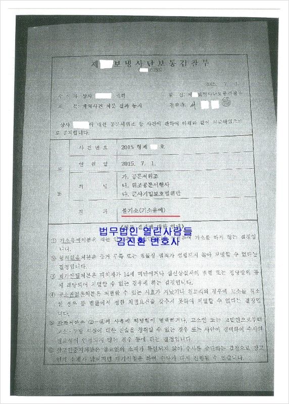 아무리 피의자에게 그와 같이 행위를 한 데에 사정이 있다고 하더라도 공문서위조나 군기법위반 범죄가 벌금형도 없고 중한 죄이기 때문에 재판에 회부되어 군생활을 접어야 하는 상황이 발생할 수도 있었습니다.