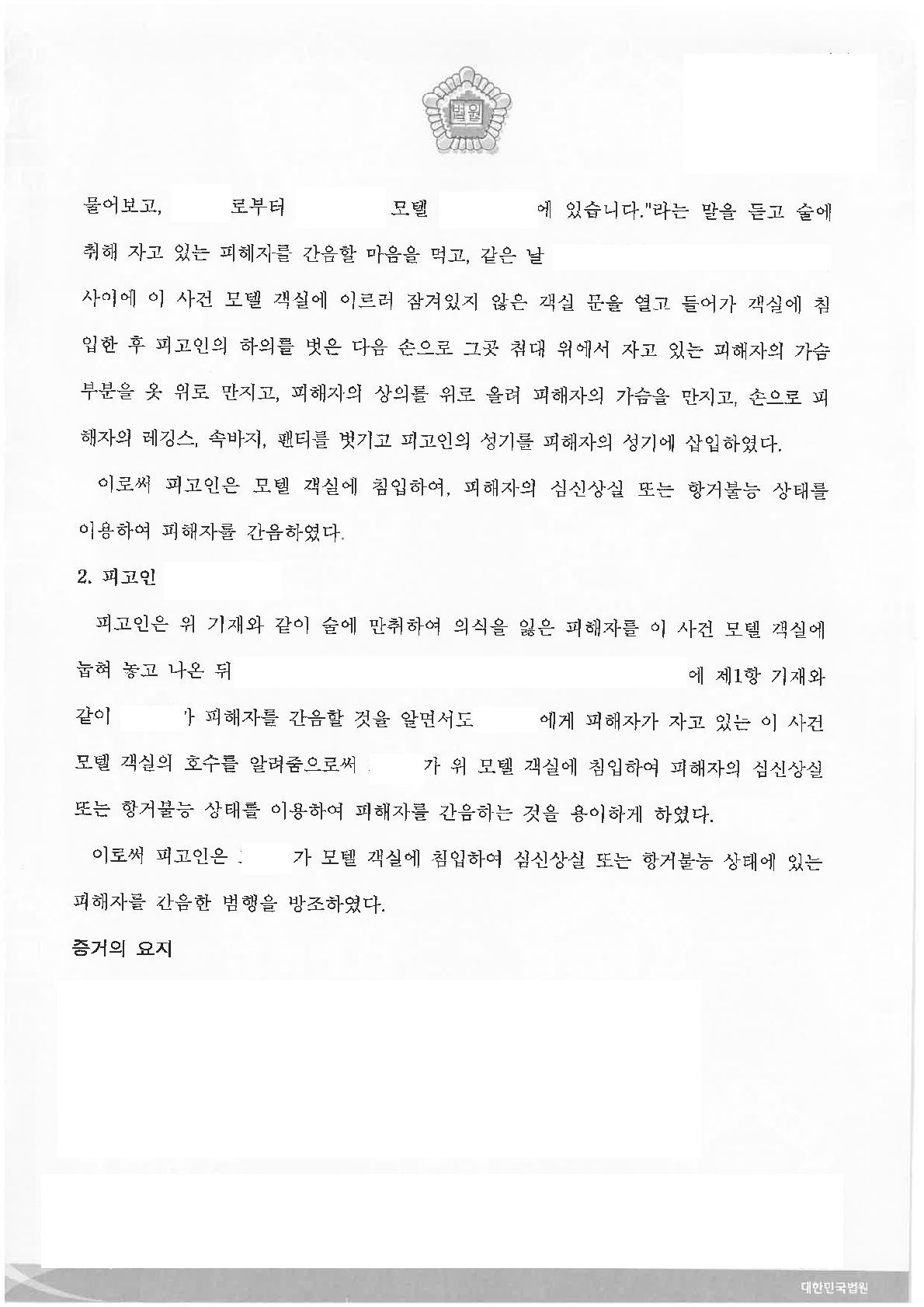 이 사건은 의뢰인이 술에 취해 의식을 잃은 피해자를 모텔 객실에 눕혀 놓고, 상피고인에게 모텔의 호실을 알려주고, 상피고인이 의식을 잃은 피해자를 강간하였다는 이유로, 주거침입준강간방조죄로 기소된 사안입니다.