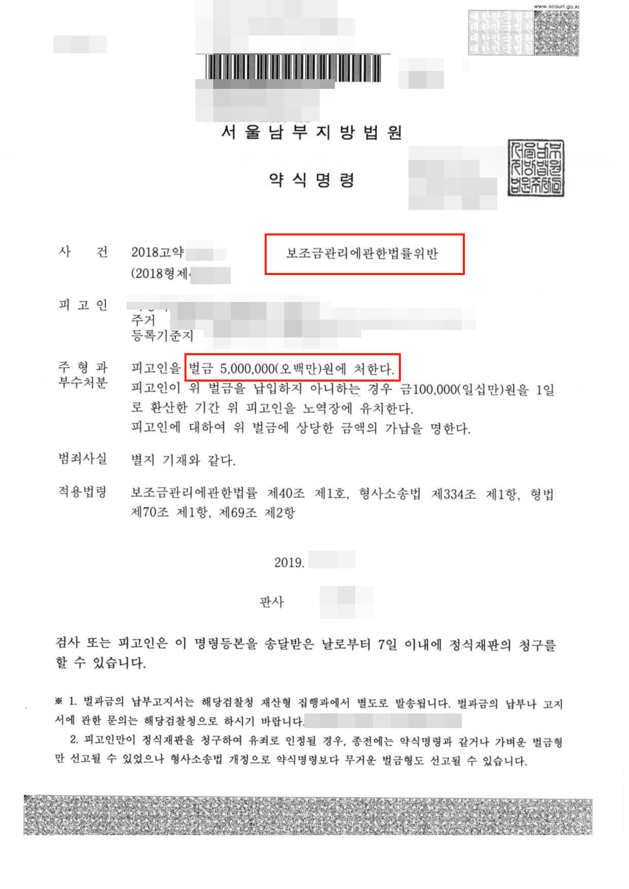 다행히 재판부는 저희 변호인의 주장을 모두 받아들여 의뢰인에게 보조금법위반 사안임에도 불구하고 벌금형(구약식)이라는 관대한 처분을 내렸습니다.