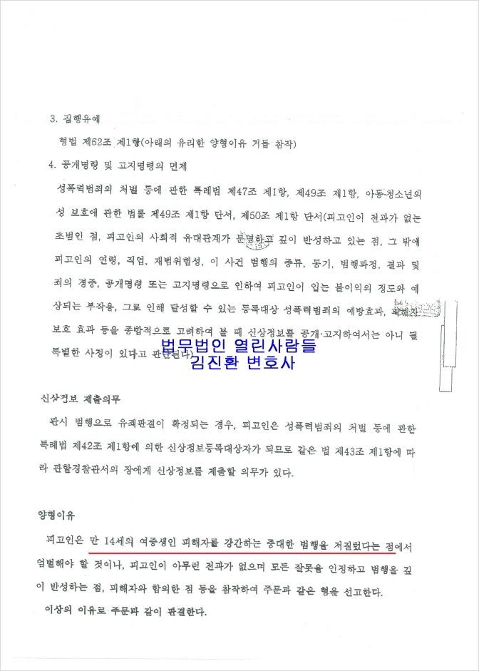 피고인은 비록 초범이었고 강간 과정에서 폭력을 행사한 것은 아니었지만 어린 피해자를 상대로 성폭행을 한 것이었기에 죄질이 약하다고는 볼 수 없었습니다.