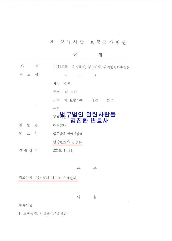 ○ 범죄사실 : 함께 경계근무를 서던 후임병을 폭행하고 가혹한 행위를 하게 하였으며 군사지식을 암기하도록 강요함