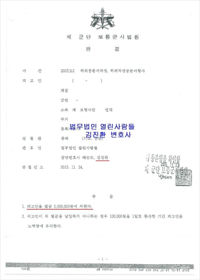 이러한 방향으로 재판을 받은 결과 다행히도 군생활을 계속할 수 있는 벌금형이 나오게 되었고 검찰에서도 항소하지 않아 피고인은 큰 탈 없이 군생활을 이어갈 수 있었습니다.