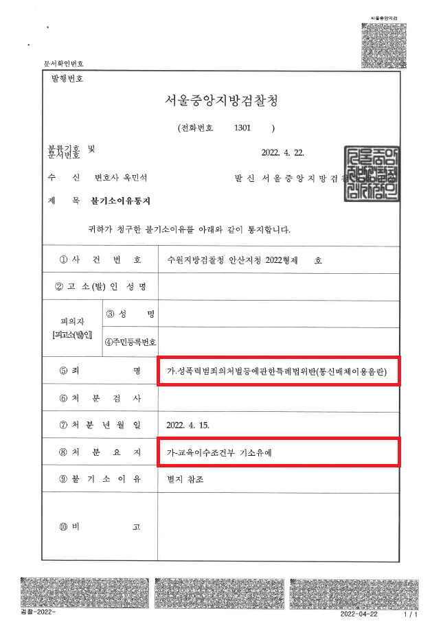 때문에 저는 기소유예 처분도 상당히 불만족스러운데요. 그러나 의뢰인께서는 합의하지 않고도 기소유예 처분을 받았다는 사실만으로 크게 만족하고 계셔서 성공사례로 업로드하게 되었습니다.