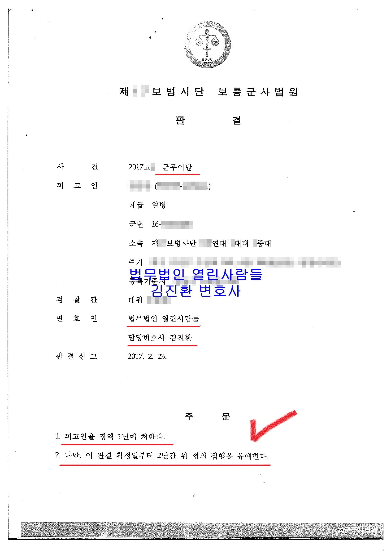 왜냐하면 재복무의사가 확고하지 않은 피고인을 부대로 복귀시키게 되면 다시 군무이탈할 가능성이 높아 상당히 중한 처벌을 받게 될 우려가 있기 때문입니다.