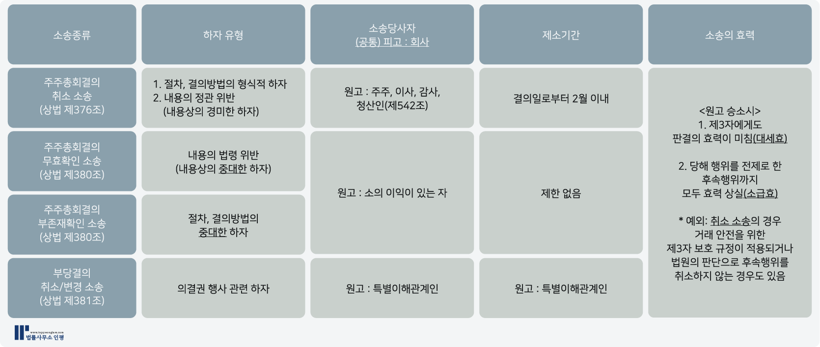 이 과정에서 주주총회결의시 절차상 또는 내용상의 하자가 발생할 경우 그 하자의 유형에 따라 소송을 제기할 수 있는데, 소송의 종류는 아래 표와 같이 4가지로 구분할 수 있습니다.