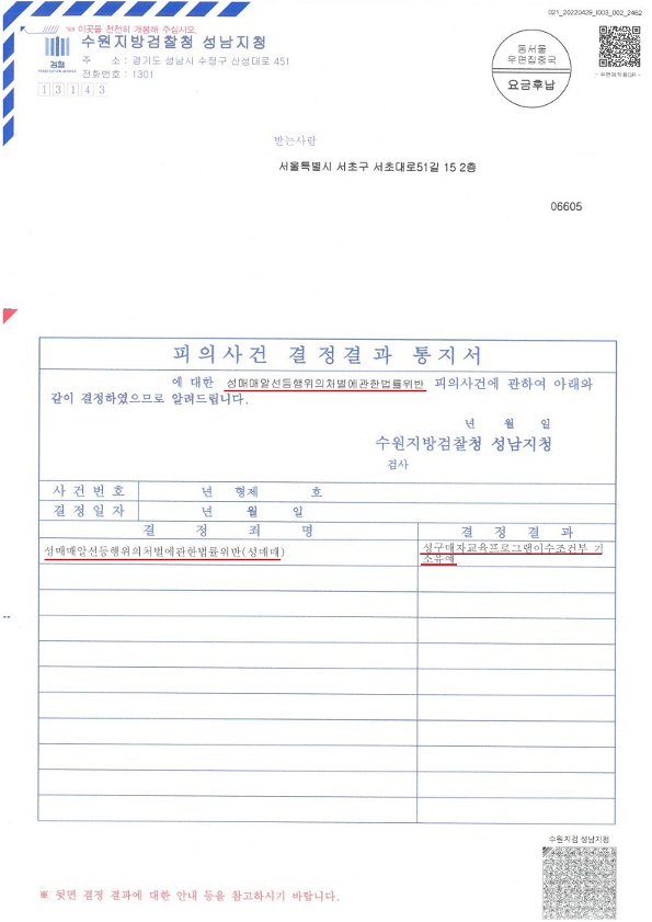 의뢰인님께서는 최근 성매매 처벌 수위에 비추어 벌금형이 선고될 위험이 높은 상황이었습니다. 그러나 앞서 말씀드린 다양한 방법으로 경찰, 검찰 수사 단계를 신중히 진행하였고 이에 수원지방검찰청 성남지청은 의뢰인님에게 "기소유예"처분을 내렸습니다.