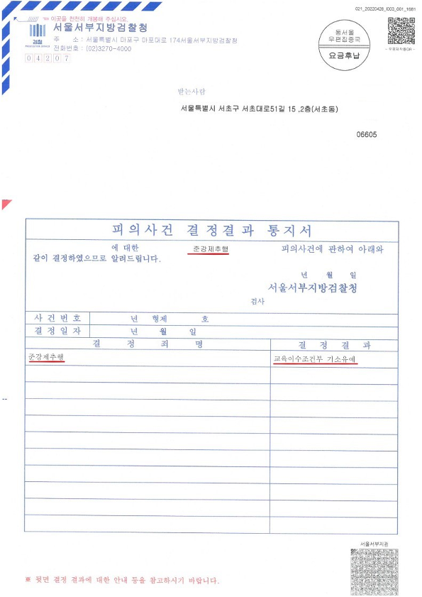 이에 서울서부지방검찰청은 "교육조건부 기소유예"처분을내렸습니다. 이에 의뢰인님께서는 어떠한 전과기록도 남지 않게 되었습니다.
