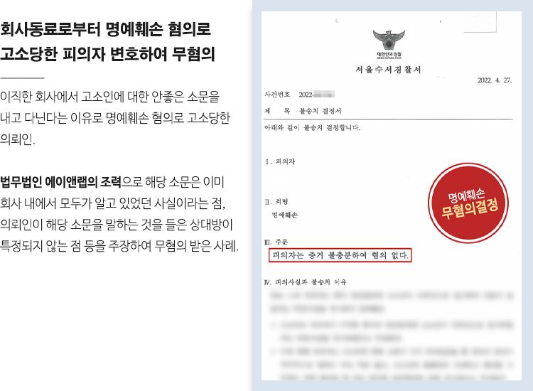 이로써 우리 의뢰인은 고소인에 대해 명예훼손을 하였다는 억울함을 풀 수 있게 되었습니다.