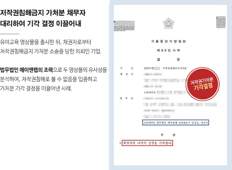 우리 의뢰인(채무자)은 유아교육영상 프로그램을 개발하는 기업으로 2018년경 이를 기반으로 제작된 영상물을 출시하였습니다. 그러나 채권자 기업에서 자사가 출시한 영상의 저작권을 침해하였다고 주장하며, 저작권침해금지 가처분 소송을 제기하였습니다.