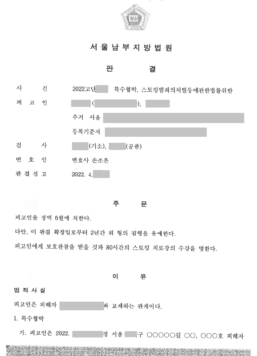 2021년 10월부터 새롭게 시행되고 있는 스토킹처벌법은 도입된지 얼마 지나지 않았지만 사건이 빠른 속도로 누적되고 있습니다. 그리고 과거에는 처벌법규가 미비하여 가볍게 처벌되곤 했던 행위에 대해서도 최근에 와서는 매우 무겁게 처벌이 이루어지고 있는 실정이고, 특히 폭행이나 협박이 수반되는 경우에는 수사단계부터 높은 확률로 구속수사가 진행되고 있는 추세입니다. 그러므로 스토킹과 같은 행위로 입건된 경우에는 수사 초기부터 스토킹처벌법의 내용을 숙지하고 있고, 경험이 축적된 형사전문변호사의 조력을 받는 것이 매우 중요합니다.