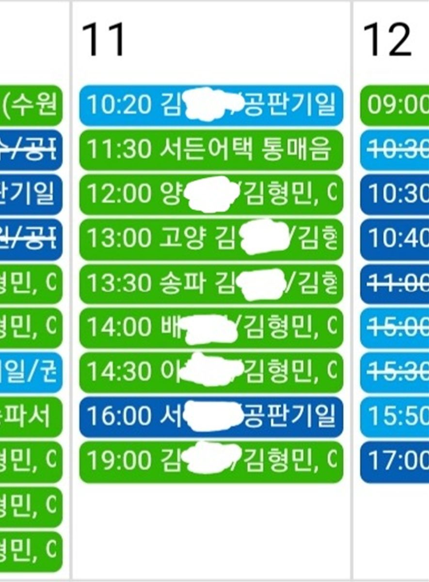 일정표를 보면 하늘색은 제 고용변호사들이 출석하는 재판일정이고 파란색은 제게 출석하는 재판일정인데 형식적인 첫 기일 등을 제외하고 증인신문, 피고인신문 등이 있는 실질적인 기일(보통 오후에 있음)은 거의 모두 제가 출석하고 있습니다. 11일 일정을 보면 12시 일정 의뢰인이 2건을 중복 고소당한 사람이라 1시간 텀을 잡은 것이고 보통은 30분 단위로 잡는데, 저는 업무가 바빠 보통 점심을 먹지 않고 있습니다. 의뢰인 협의, 상담, 재판 등 업무가 많아 서면작성 등의 업무는 보통 아침, 저녁 그리고 주말 빈 시간을 이용하고 있습니다.