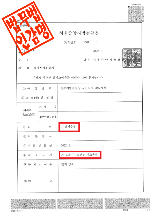전주지방검찰청 군산지청은 이 사건에 대해 다음과 같은 사유로 불기소 처분을 하였습니다.