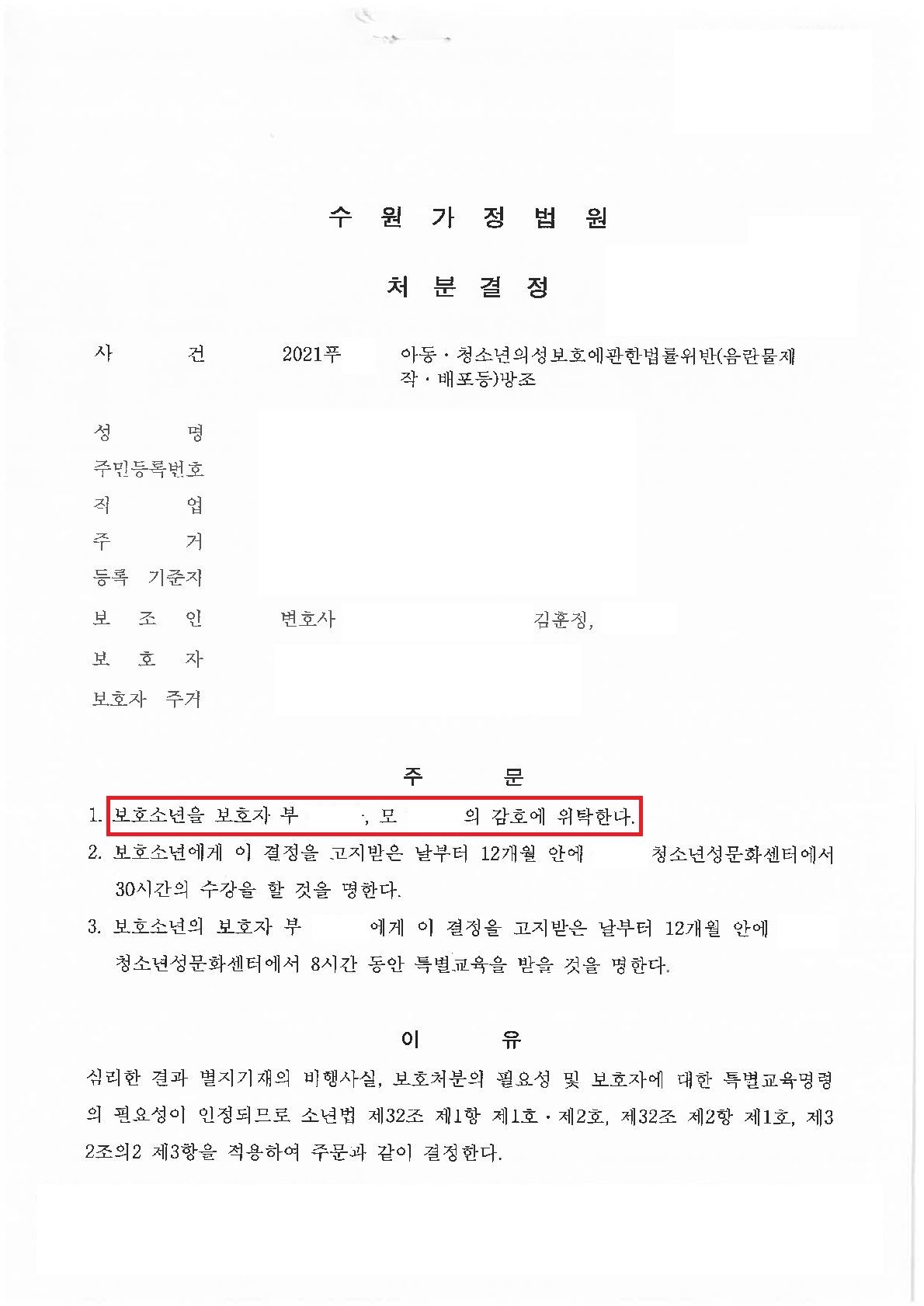 다행히 검찰에서 이 사건을 소년부로 송치하였고, 소년법원에서는 의뢰인에게 보호자(부모) 감호 처분을 하였습니다. 의뢰인은 어린 마음에 장난식으로 검색행위를 하였던 것이지만, 이 사건은 사회적으로 큰 물의를 빚었던 사건이고 동종 사례에서 피의자들은 소년원에 가는 등 엄벌에 처하여졌다는 점에서 결코 가벼운 사건은 아니었습니다. 의뢰인은 적극적으로 자신이 가담하지 않은 부분에 대해 방어하고, 잘못한 부분에 대해 반성하여 이례적으로 경한 처벌을 받았고, 최선의 결과를 받은 것이었습니다.