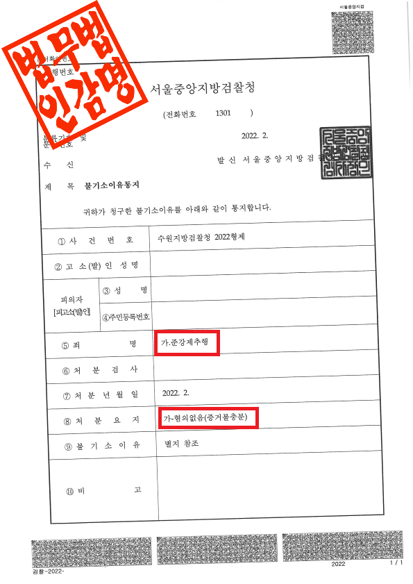 ○ 수원지방검찰청은 이 사건에 대해 다음과 같은 사유로 불기소(혐의없음) 결정을 하였습니다.