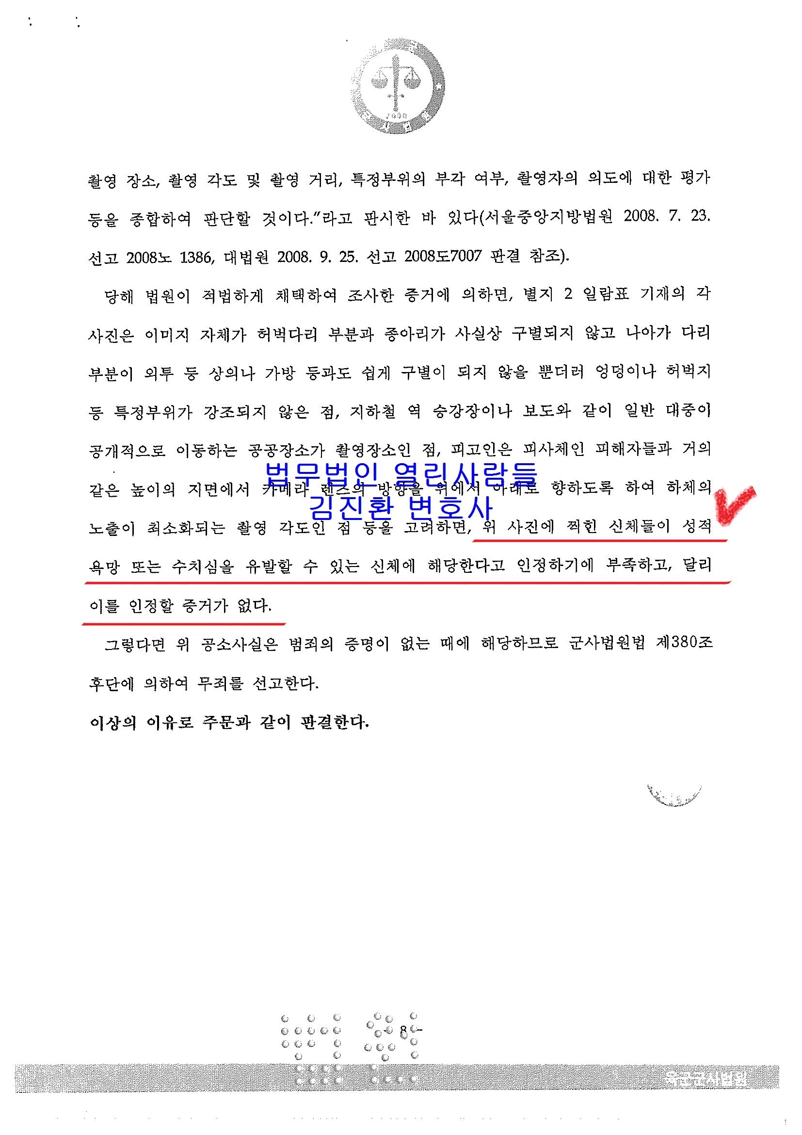 재판부는 상당수 사진에 대해 무죄를 선고한 이유에 대해 다리 부분이 크게 부각되어 있지 않고 엉덩이나 허벅지 등 특정부위가 강조되어 있지도 않으며 촬영장소가 일반 대중이 공개적으로 이동하는 공공장소이고, 피고인이 피해자들과 거의 같은 높이에서 사진 촬영을 하여 하체의 노출이 최소화되어 있는 점 등을 고려하여 사진들이 성적욕망 또는 수치심을 유발할 수 있는 신체 부위를 촬영한 것은 아니라고 이유를 밝혔습니다.