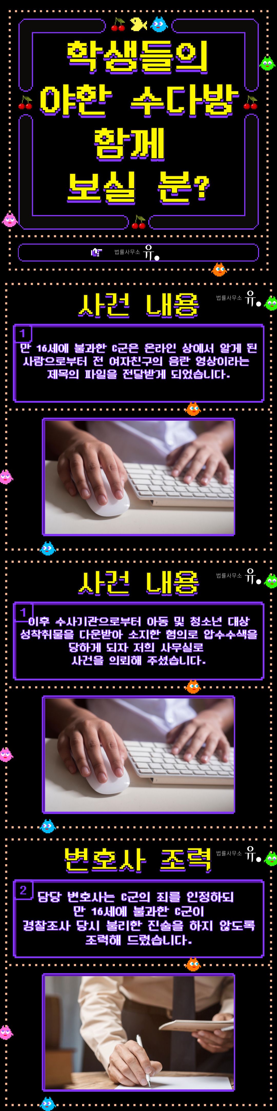 만 16세에 불과한 의뢰인은 온라인상 알게 된 사람으로부터 전 여자친구의 음란 영상이라는 제목의 파일을 전달받게 되었는데, 이후 수사기관으로부터 아동·청소년 대상 성 착취물을 다운받아 소지한 혐의로 압수, 수색을 당하게 되자 저희 사무실에 사건을 의뢰해 주셨습니다. 그런데 최근 사회적으로 문제가 되었던 여러 가지 사건들로 인해 아동·청소년 대상 범죄의 경우 자칫 중한 처벌을 받을 수도 있는 상황이었습니다.