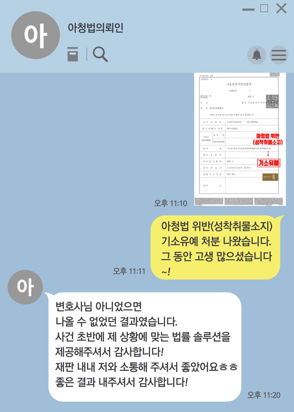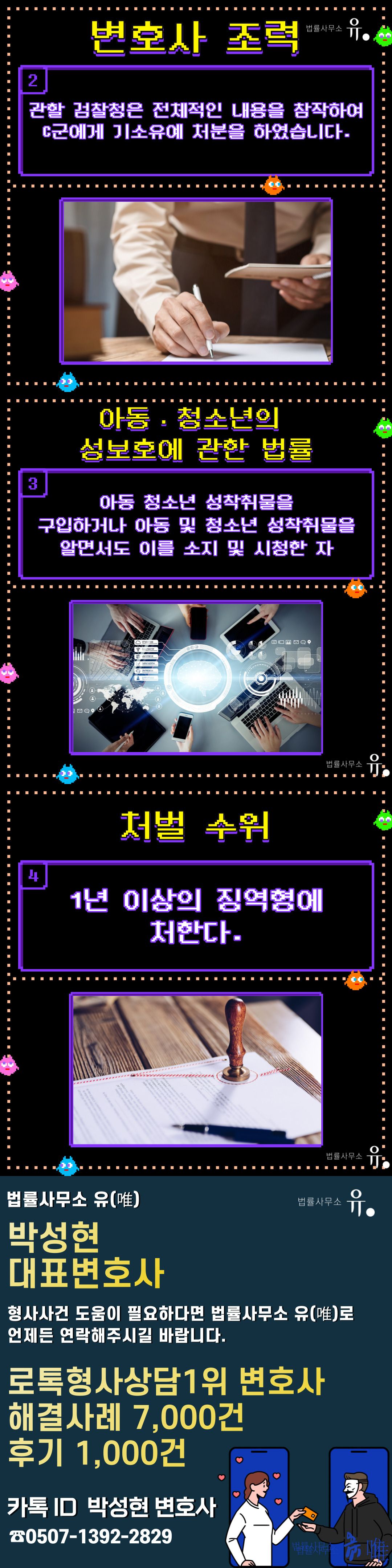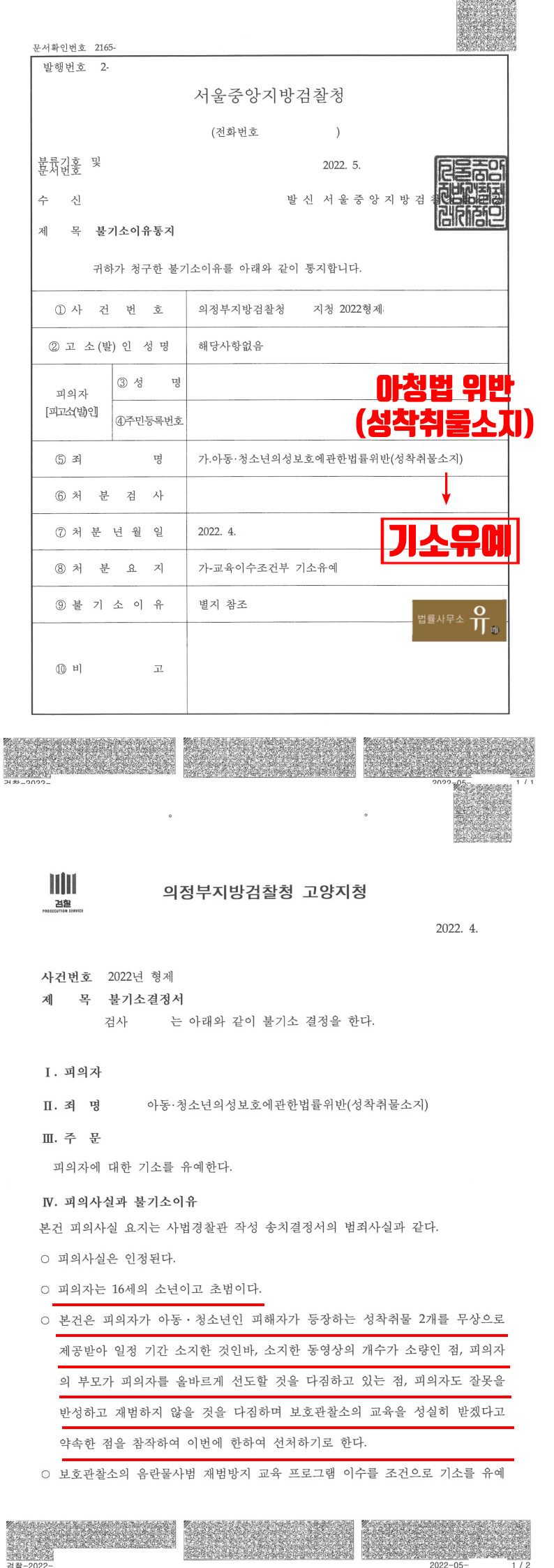 의정부지방검찰청 고양지청은 피의자(의뢰인)의 범죄사실을 인정하면서도, 법률사무소 유(唯)성범죄 전문 변호사가 작성한 변호인의견서 내용을 그대로 받아들여 피의자가 성착취물을 소량으로 소지하고 있는 점, 피의자가 잘못을 진심으로 반성하고 재범하지 않을 것을 다짐하고 있는 점 등을 고려하여 기소유예 처분을 하였습니다.