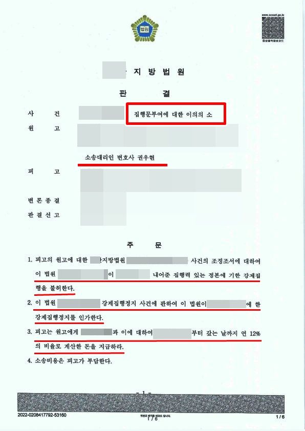 * 집행문 부여에 대한 이의의 소에서 승소한 사례 하나를 소개합니다.