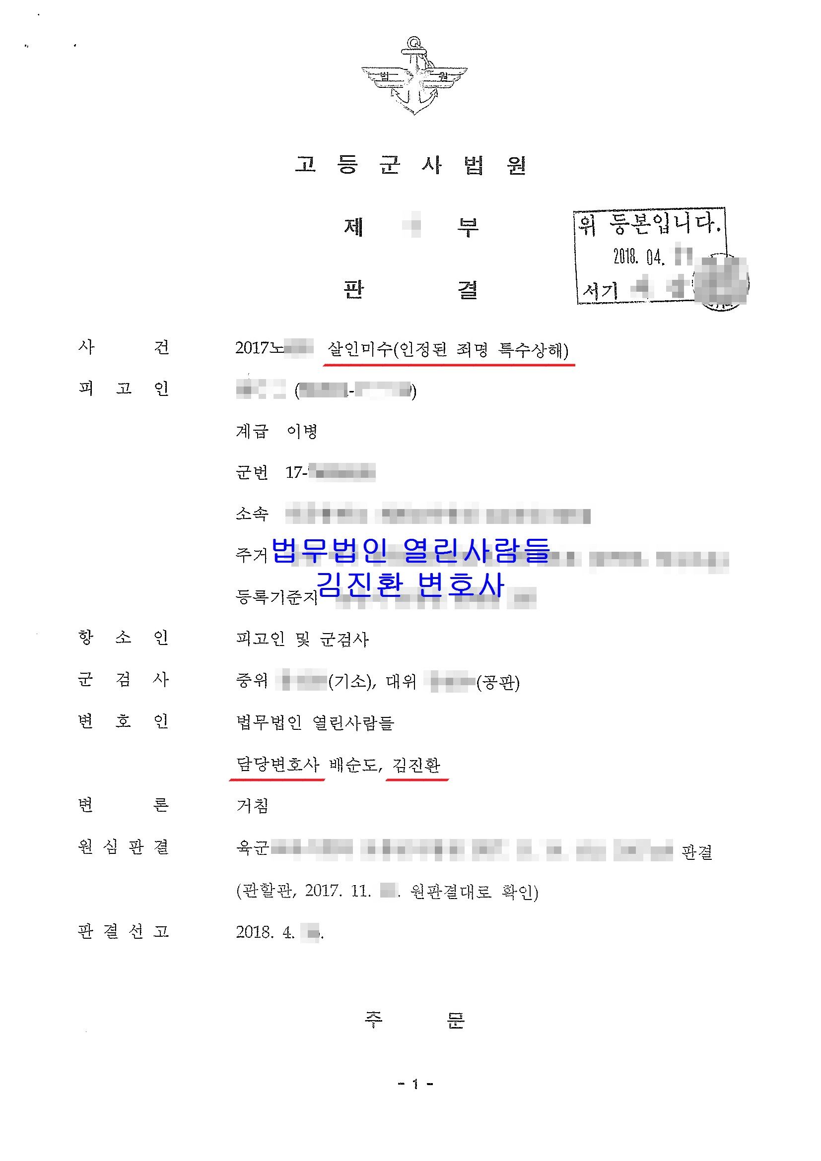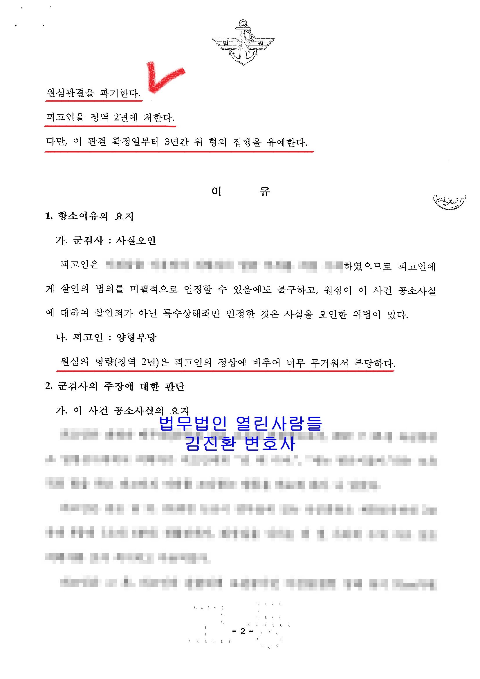 그러한 결과 고등군사법원 항소심에서는 살인의 고의를 부정한 원심의 판단이 옳다고 판단하면서도 여러 정상관계를 고려해보면 원심의 형(2년)은 너무 과도하므로 형을 감경하여 집행유예를 선고해 주셨습니다.