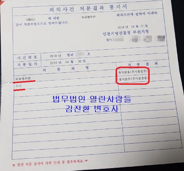 그러자 검사님이 조사가 다 마쳤다고 하시면서 조금만 기다리시면 결과를 받으실 수 있을 거라고 하셨고 얼마후 모든 피의사실에 대해 무혐의 처분을 내렸다는 결정서를 받을 수 있었습니다.