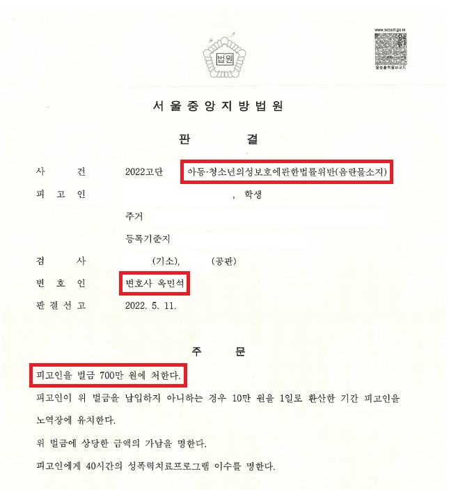 이러한 저의 조력을 바탕으로 A씨는 경찰, 검찰 조사 때 혐의를 부인하였음에도 불구하고 벌금형을 선고받음으로써 신상정보 등록 대상에도 해당되지 않게 될 수 있었습니다.