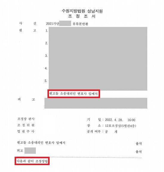 2회에 걸친 조정으로 당사자간의 이견을 좁혀나갔고 결국 피고로부터 1억원을 지급받기로 하여 성공적으로 조정이 성립되었습니다.
