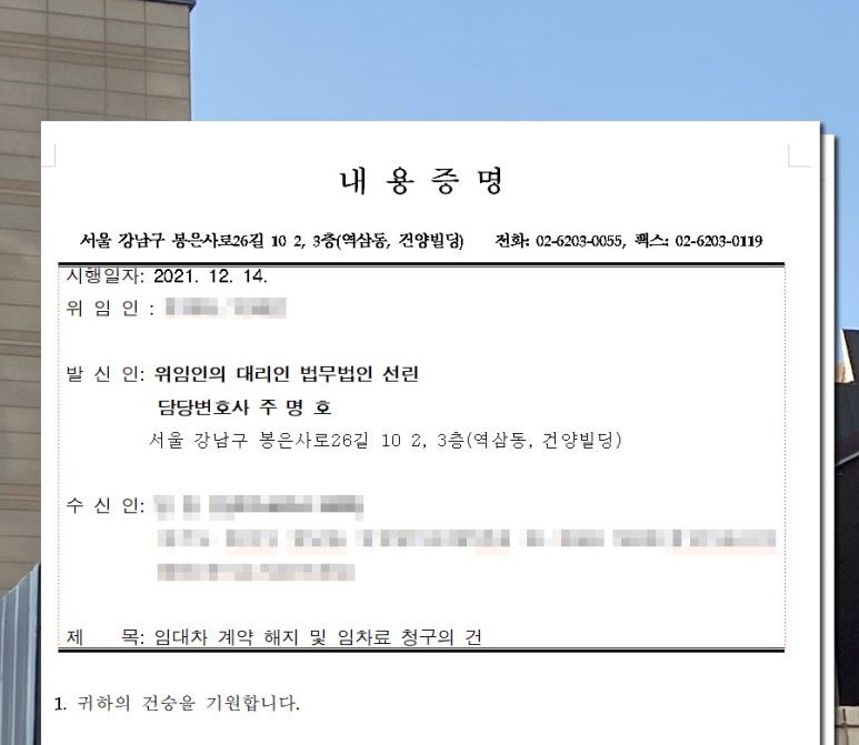 계약 해지 사유가 발생이 되었고 계약 해지를 하기 위해서는 임차인에게 계약 해지의 의사표시를 해야 합니다. 전화, 문자, 카톡 등을 이용하기도 하지만 소송을 하면서 임차인이 문자메시지 확인을 못했다고 하거나 내 명의 핸드폰이지만 내가 사용하지 않는다고 우긴다면 소송이 원활하게 진행되지 않을 수 있습니다.