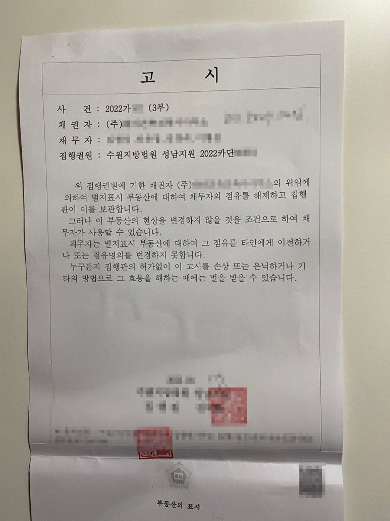 가장 최근에 집행한 사건의 경우 초인종을 누르고 문을 두드려도 사람이 나오지 않자 강제로 문을 열려고 하니 임차인이 놀라서 문을 열어주더군요. 엄청 당황하고 놀란 표정이었고 왜 법원에서 집행을 하는지 정확히 설명을 해주고 아래와 같은 고시를 신발장에 붙였습니다.