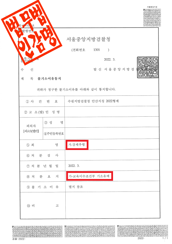 수원지방검찰청 안산지청은 이 사건에 대해 다음과 같은 사유로 불기소 처분을 하였습니다.