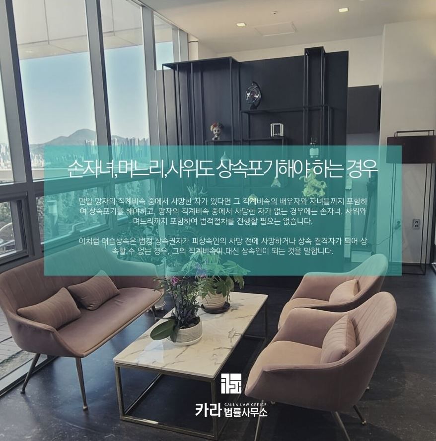 다시 말해 아버지가 사망하여 3형제가 법정상속인이 되었는데 3형제중 장남이 아버지보다 먼저 사망하였고 장남에게 처와 자식이 있다면 사망한 장남을 대신해 그 가족이 대습상속인이 되기 때문에 장남의 처와 자식, 그러니까 망자 중심에서 보자면 첫째 아들의 며느리와 손자녀가 상속포기를 해야 한다는 뜻입니다.