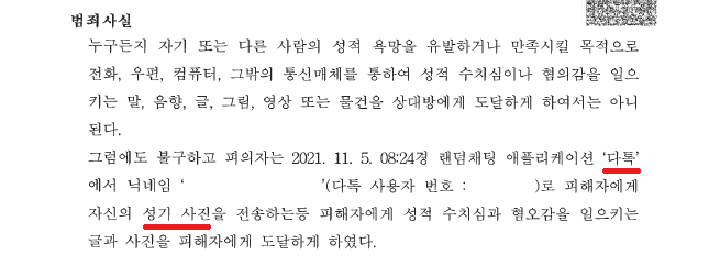 그런데 얼마 뒤, A씨는 경찰로부터 "B씨가 '다톡'에서 A씨로부터 성기 사진을 전송받고 성적 수치심을 느꼈다며 고소를 하여 조사를 받아야 한다"라는 전화를 받았습니다.